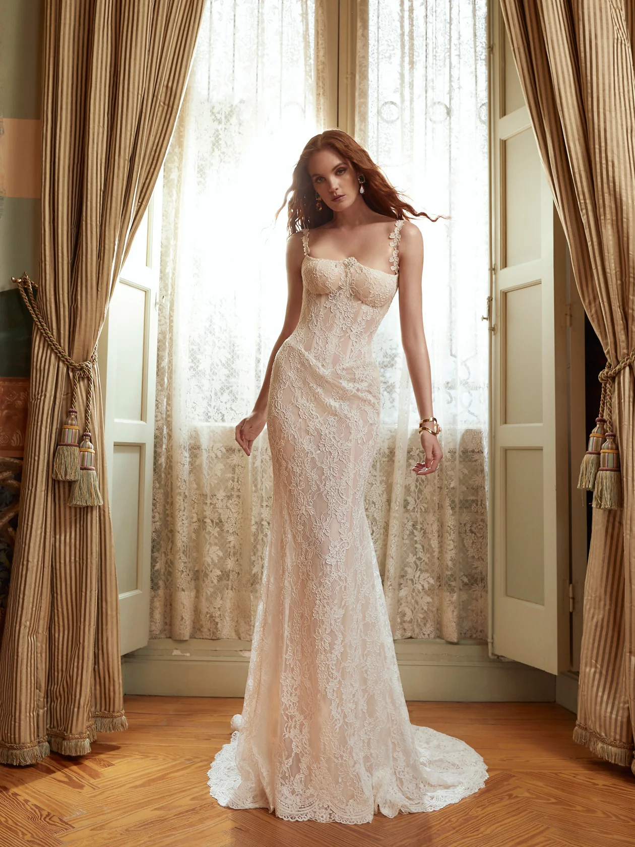 Stun in "Anais", a testament to the precision of couture craftsmanship tailored to flatter the silhouette flawlessly. With its structured corset and daring sheer back in exquisite corded French lace fabric, this gown is sophisticated in its simplicity. The seductive angel wing neckline and delicate floral straps sit gracefully, while the pointed waistline seam that flows into a fit and flare style exudes subtle femininity. Add the voluminous, constructed Anais overskirt for a dose of drama.