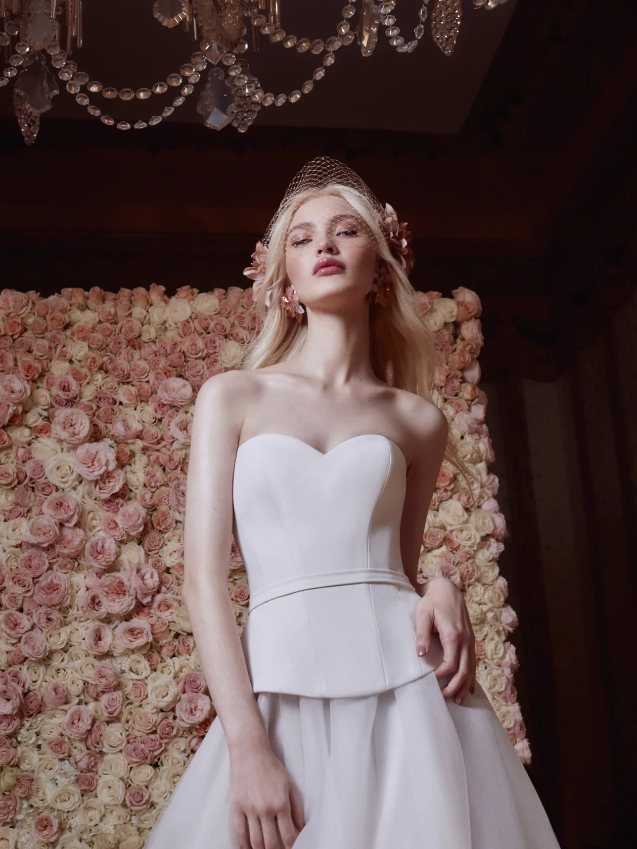 Float like a cloud in āBoldā, a gorgeous two-piece that pairs a light A-line tulle skirt with a strapless peplum corset top in smooth silk. The oversize bow detail that streams down the skirt adds drama to the back of a minimalist design. Bridal sophistication with a contemporary edge.