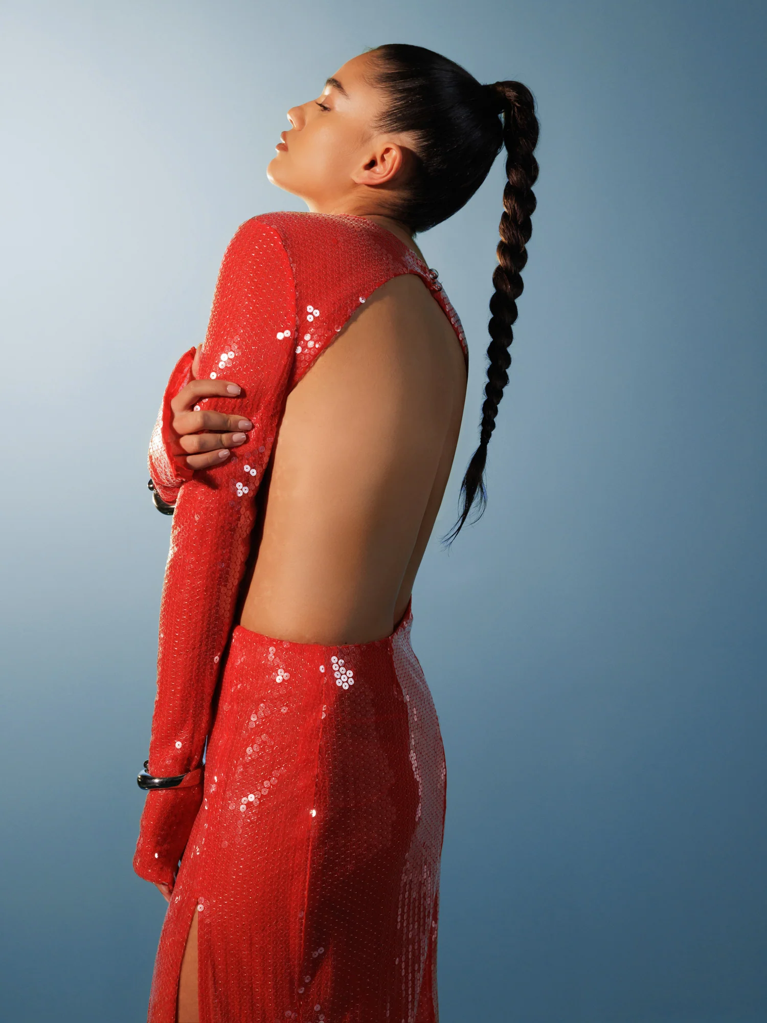 Make a bold and sexy statement in our red high-neck long-sleeve "Cabernet" gown with asymmetrical cut-out that exposes the midriff and back. The high slit reveals even more skin.