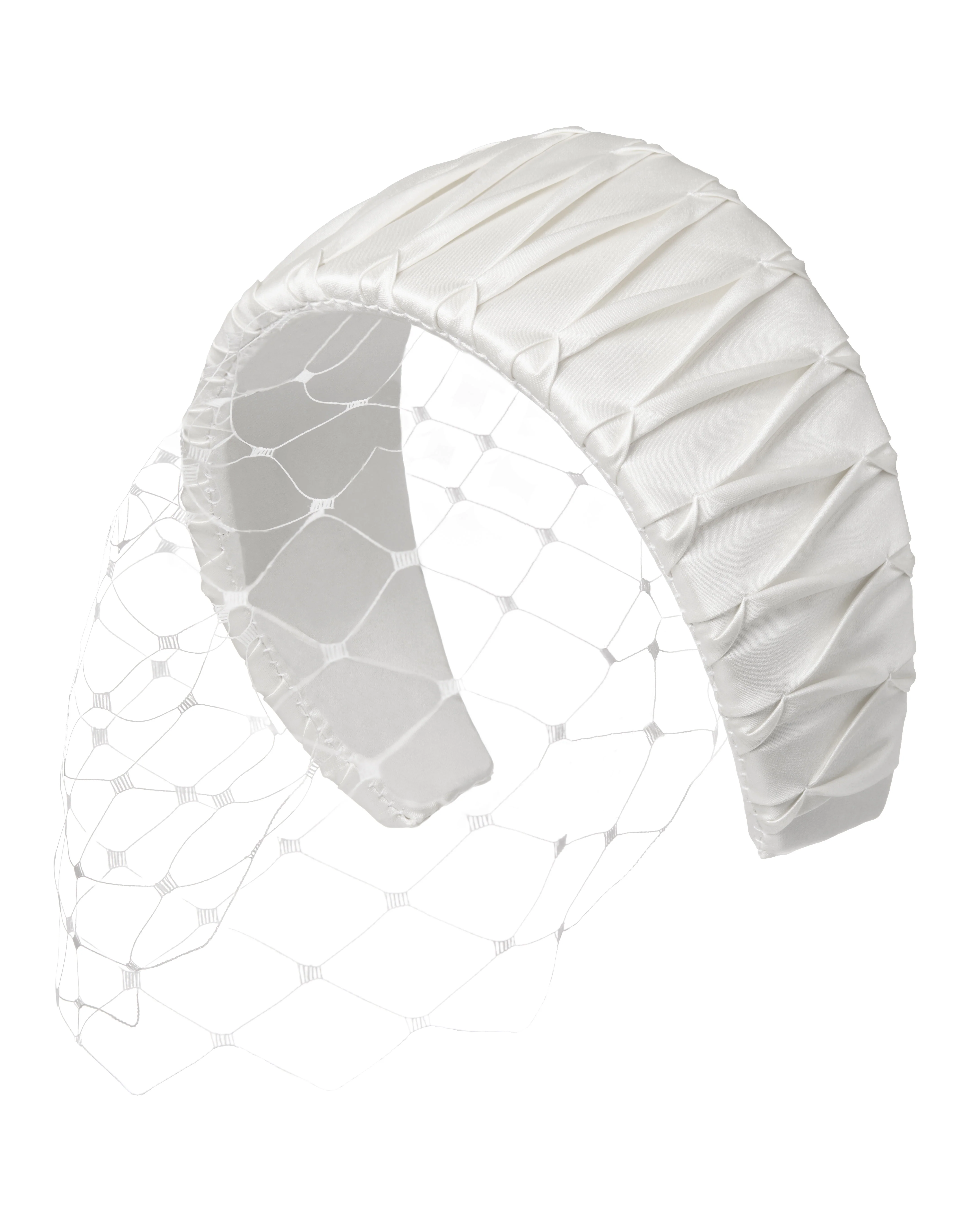 The Graziana headpiece reimagines bridal versatility. Tailored in pleated white silk, our signature style is designed with a removable veil, allowing brides to transition from ceremony formality to modern, after-party edge with ease.