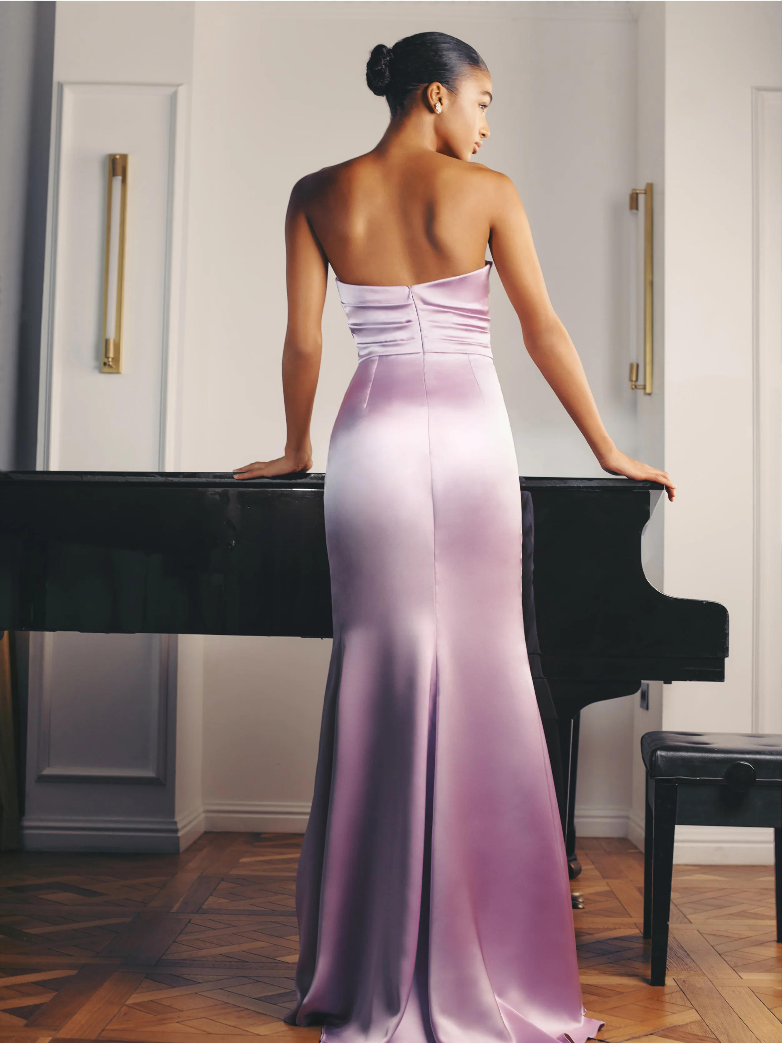 "Hannah" in tranquil and feminine lilac is created in soft satin with internal corset. Sweet and sexy, her feminine draping and strapless cut highlights the décolleté, while the thigh-high side slit of the slim-fit skirt is designed to shape the contours of the body.