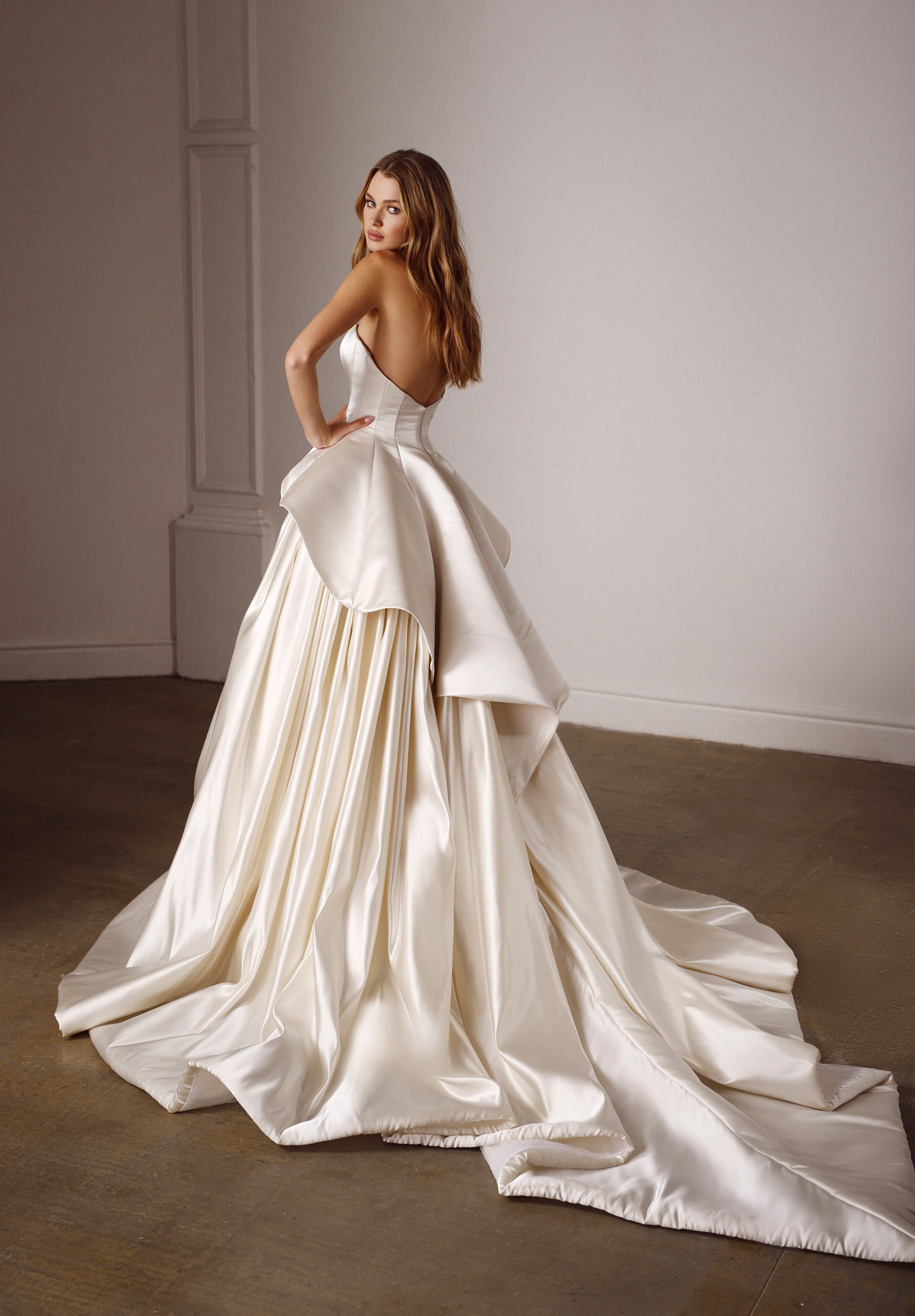 When only a statement satin couture ball gown will do, âLady Gâ is the ultimate fashion statement. This luxurious showstopper, with its voluminous silhouette and drape, has become one of our most loved designs. Featuring a chic strapless peplum corset top and full gathered, layered skirt with pointed-tail train, Lady G is the epitome of Galia Lahav couture. Add the detachable puff Lady Di-inspired sleeves for a whole new look. Perfect for the bride whose bible is Vogue.