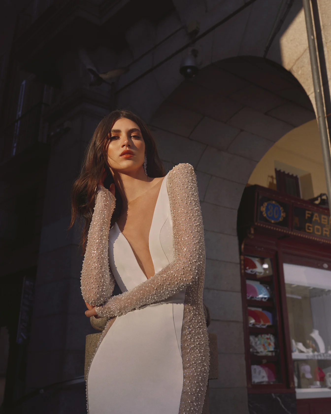 āLeonieā from the GALA collection Encanto charms like no other gown. Shimmering and sheer in all the right places, this form-fitting mermaid gown featuring low V-plunge in the front and back with exposed side panels and sleeves is a sexier interpretation of a classic silhouette. Complete the look with a sparkling veil for an enchanting bridal ensemble.