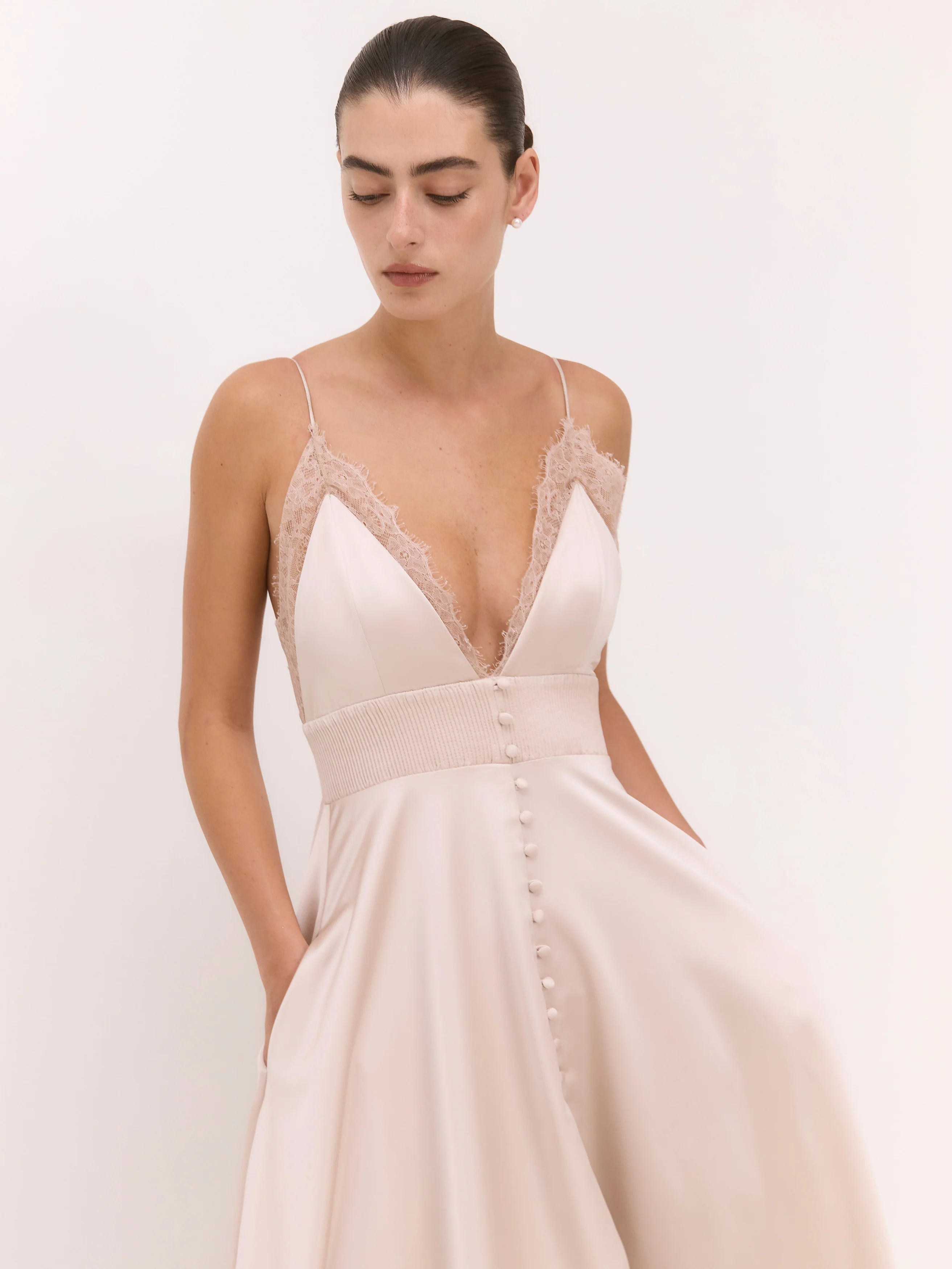Lilah is a romantic vision of effortless elegance. This maxi dress features a flattering V-neckline, delicate lace trim, and dainty buttons that trace the full length of the front seam. Softly feminine and gracefully understated, itās perfect for the bride who adores classic beauty with a hint of vintage allure.