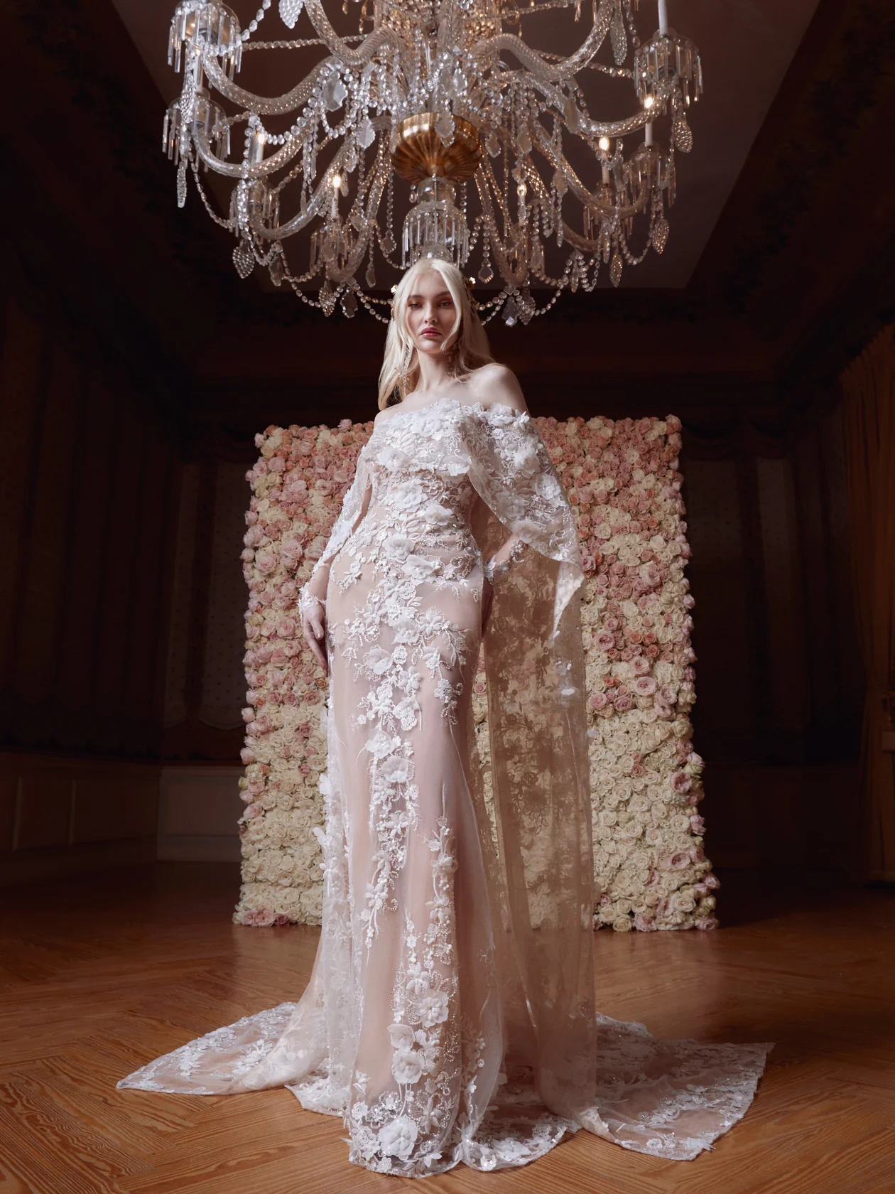 Make a statement in âLyricâ, a long, strapless, sheer nude mermaid gown with 3D sparkly floral lace. Add the dramatic off-the-shoulder cape and sheer, appliquĂ©s gloved sleeves. Sexy and stylish combined.