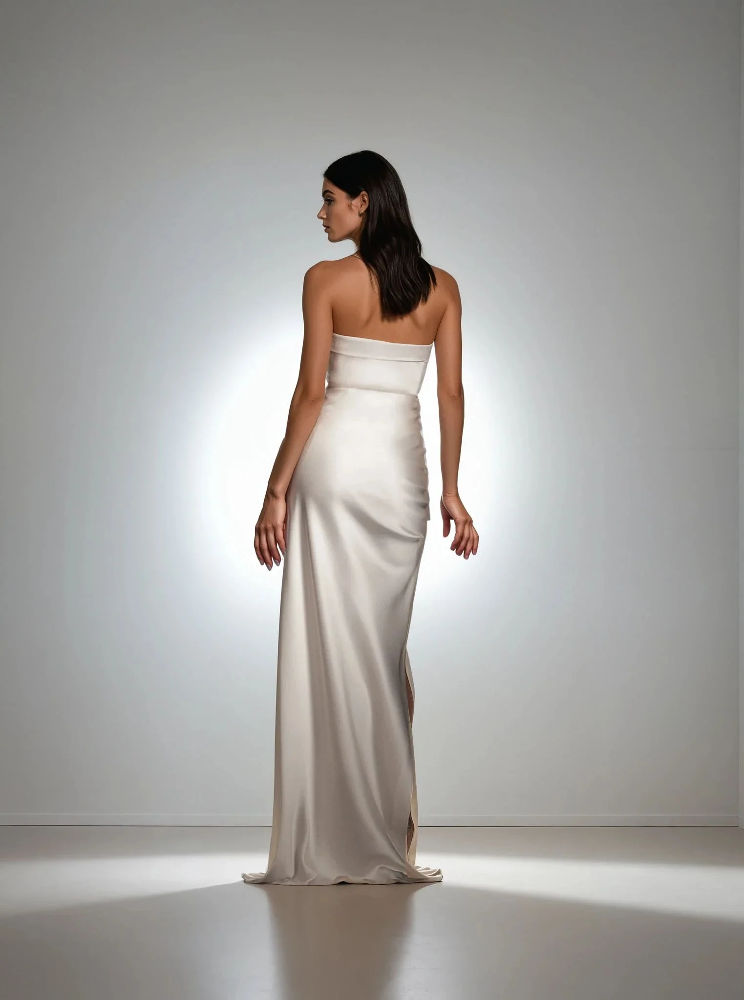 Introducing the "Molly" strapless gown in ivory. With a draped banded neckline and internal fully boned bodice for a defined silhouette that transitions into a satin skirt. Molly is accentuated by a bold side slit with drawstring feature. Designed for the bride who embraces grace, glamor and, style, complete the look with the detachable off-the-shoulder "Molly Mae" silk top.