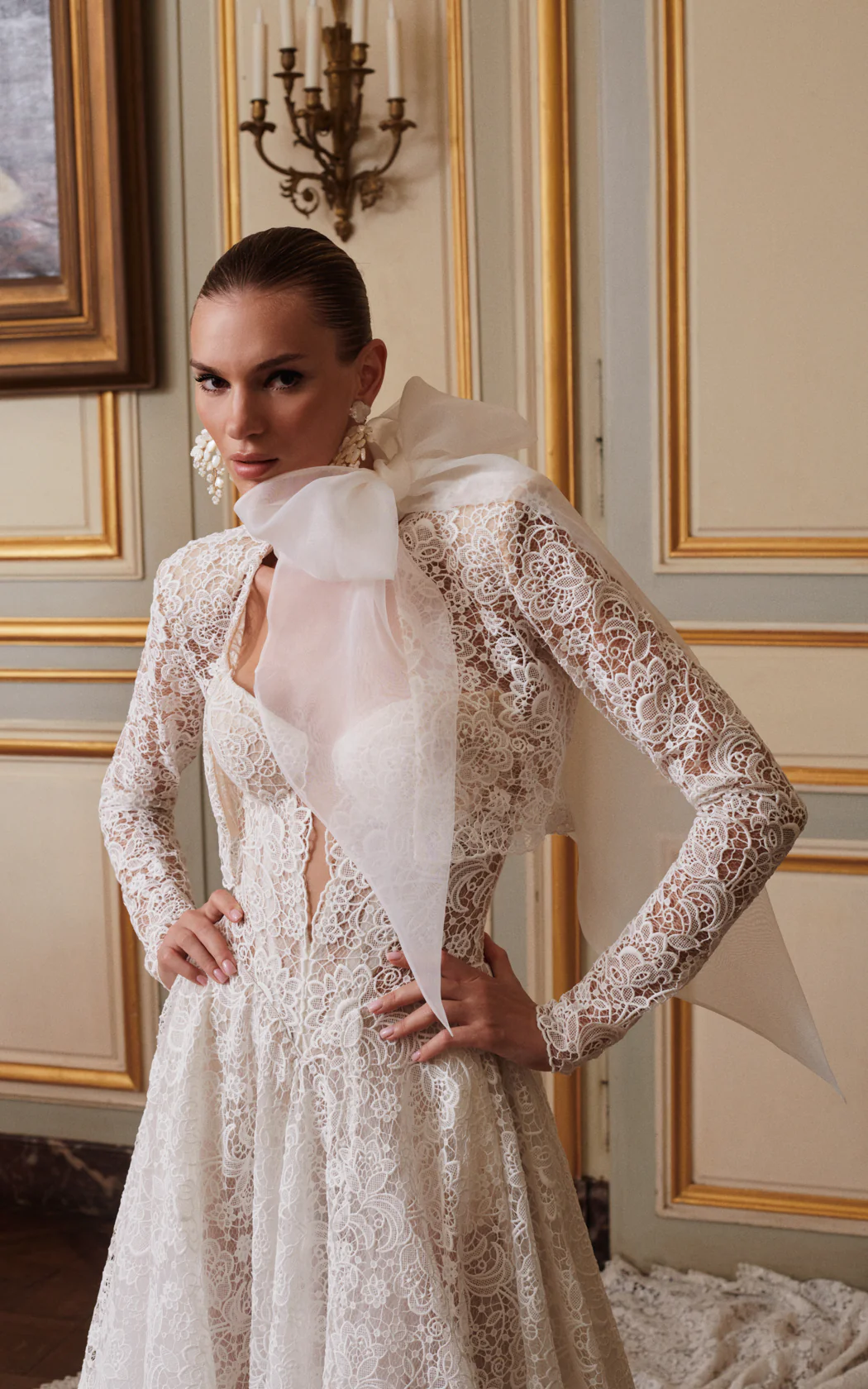 Experience the Parisian-inspired beauty of "Opéra," a mesmerizing corseted, basque waist ball gown designed to enhance the silhouette and shape of the body. Crafted in exquisite French guipure lace renowned for its intricate patterns and texture created by a continuous thread, the cat-eye plunging neckline flatters the bustline. The pièce de résistance is a breathtakingly grand extended cathedral train with matching bolero. Sculpted to perfection and adorned with the most intricate lace details, the Opéra bride is sophisticated and graceful with a hint of drama, capturing the joie de vivre of Paris.