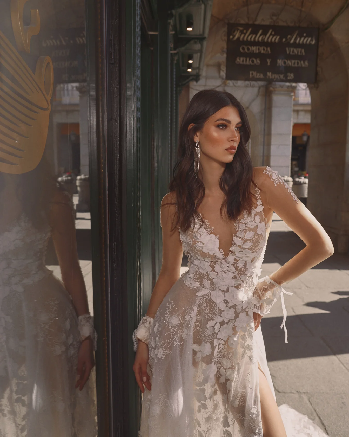 "Reese" blends sexy charm with soft romance. The A-line style offers intricate lace detailing, a low V-plunge neckline with petal details, and a sheer low back with three blossom buttons. The floral bell sheer sleeves tied with bows at the lace cuffs are a beautiful feature. Uniquely yours, Reese is a perfect choice if you dream of elegance with a hint of flirtatiousness on your special day.