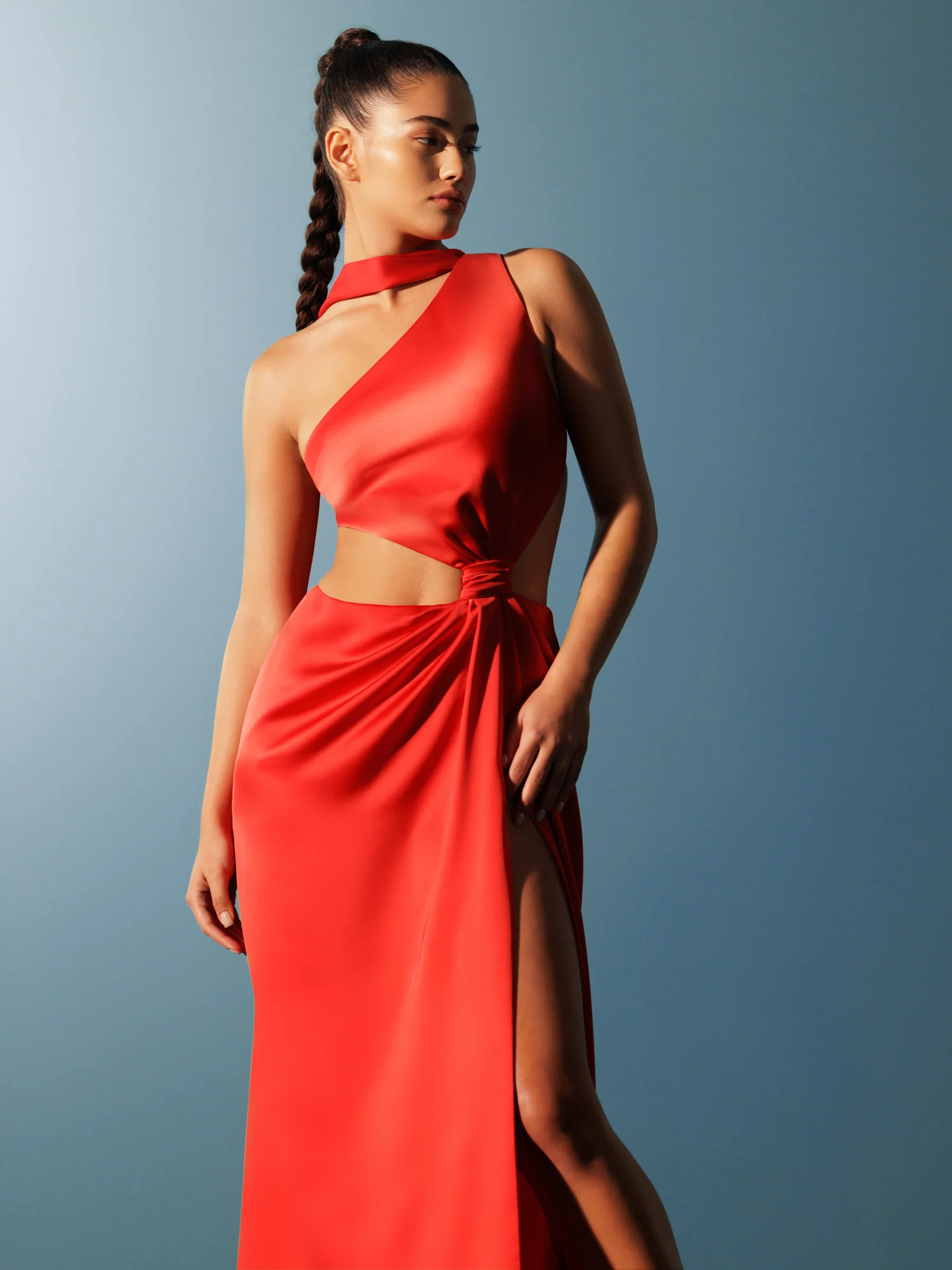 "Shelley" is our jungle goddess A-symmetrical ruby red satin gown with a midriff cutout, high side slit and silky shawl adorning the neck, draped over the open back.