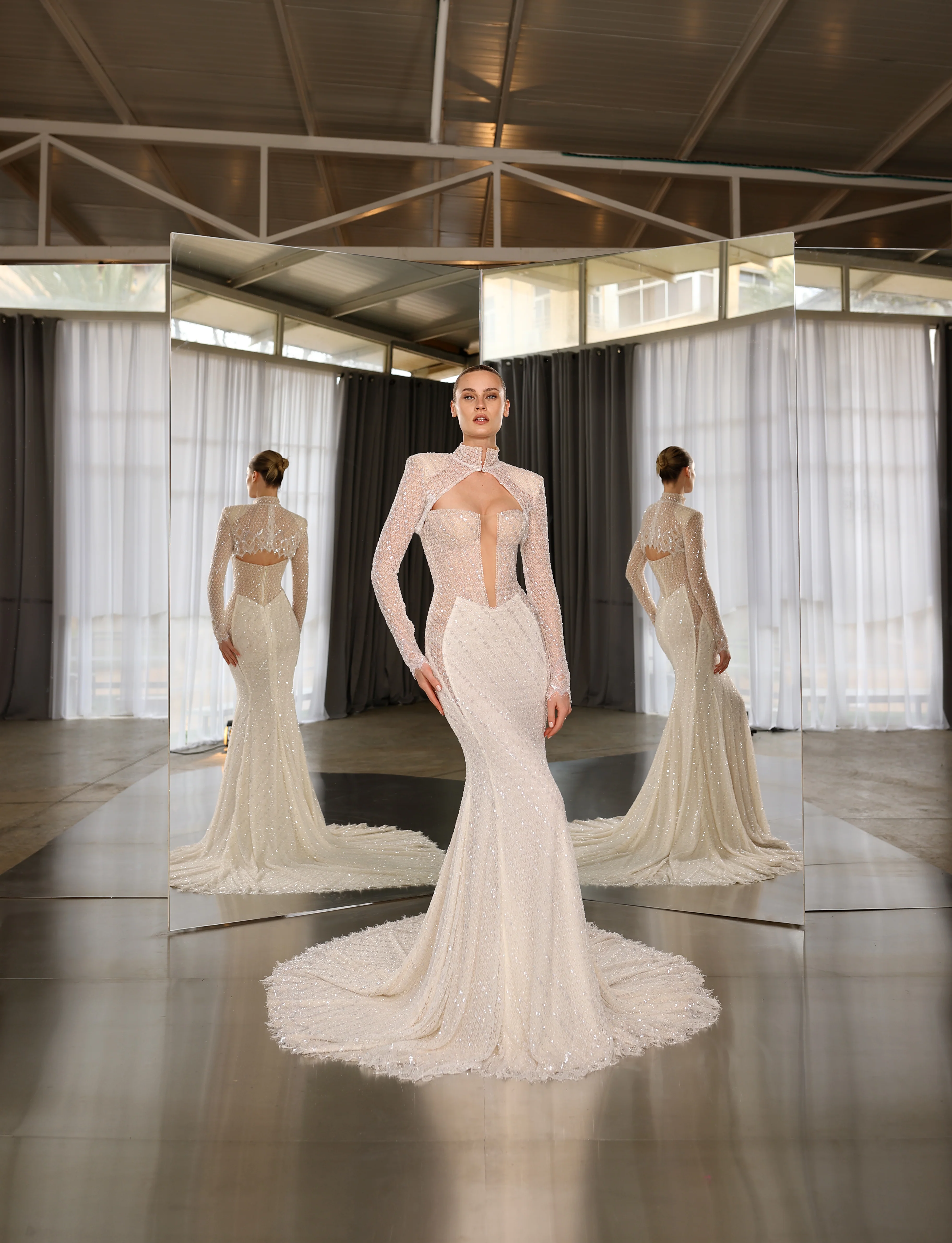 Embrace your inner bridal fashionista and make a statement with this strapless corset gown. "Tokyo" features sparkling diamond-shaped grid embroidery with deeply plunged waist and cutouts for a striking silhouette. Paired with a short-tailored bolero as a showstopper of the highest luxury, Tokyo offers architectural sophistication. Complete with a cathedral train for grandeur and glitter detail for glamour.
