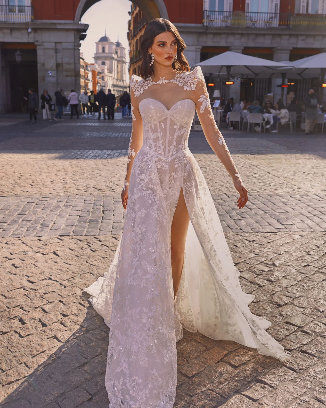 If you love the versatility of two-in-one gowns, meet sparkling sheer corset gown āUmaā that can be worn strapless or paired with a sharp-shouldered lace bolero. The high slit brings femininity and charm, while the intricate floral lace motif provides exquisite detail. With its A-line shape and long train, the beauty of Uma is endless.
